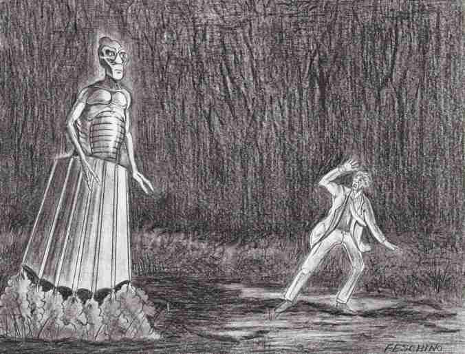 The huge alien quickly hovered towards Snitowsky, followed him back to the car—even stalked the hysterical couple circling their automobile for a time! Other weirdness ensued...